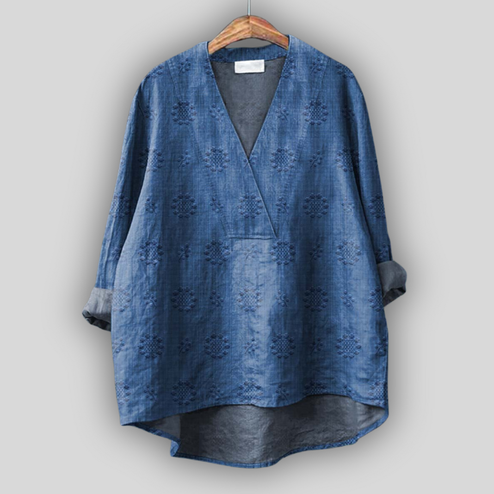 Elegantní lněná blůza v teplém zlatém odstínu s jemnými vyšívanými vzory, které dodávají luxus a sofistikovanost. Má výstřih do V v křížovém designu a asymetrický střih s delší zadní částí pro moderní vzhled. Její volný střih nabízí pohodlí a styl, ideální pro elegantní neformální vzhled, stejně jako pro zvláštní příležitosti.