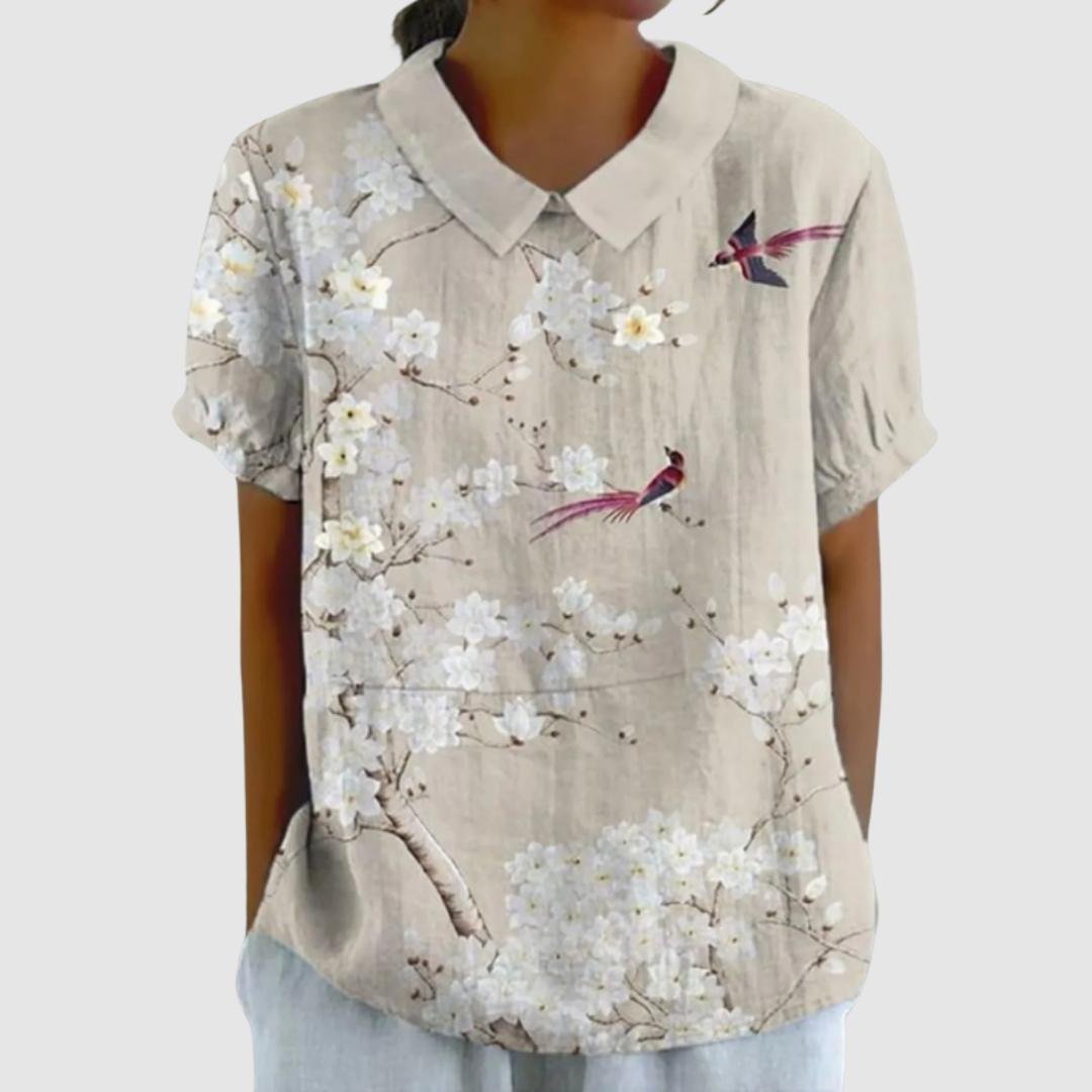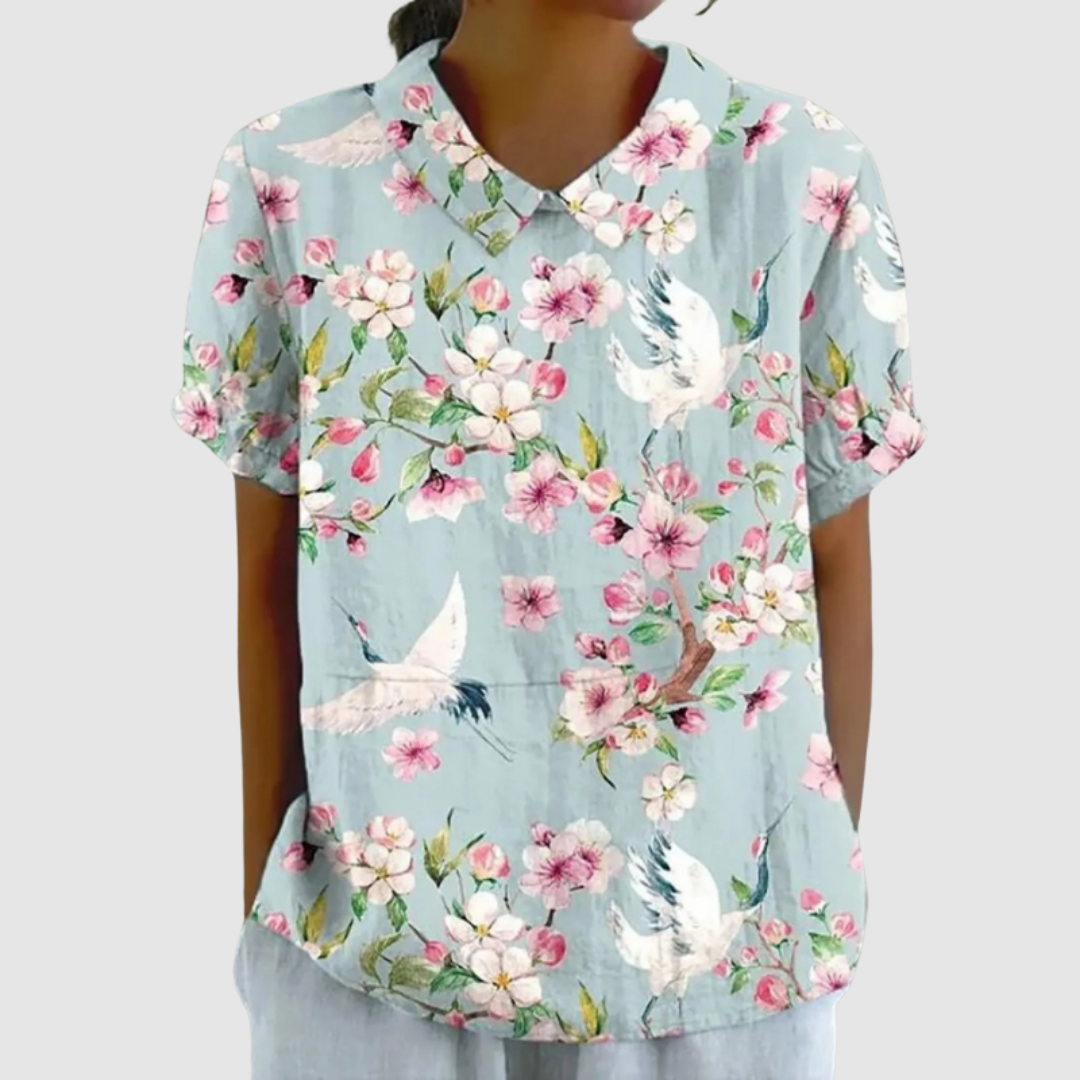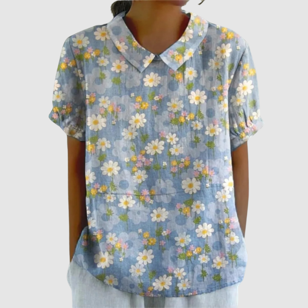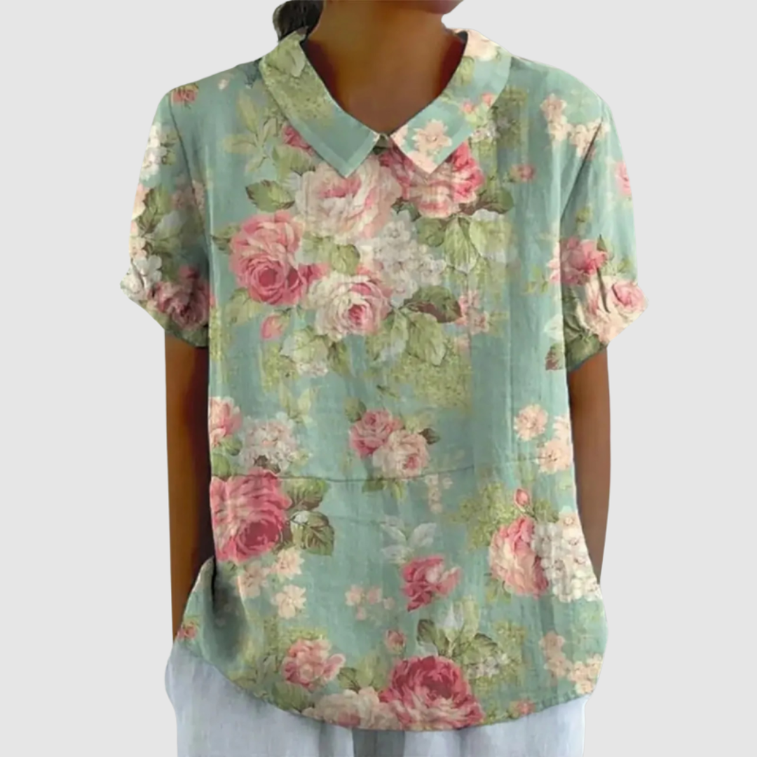 Tato halenka spojuje romantický vzhled s pohodlným střihem. Květinový vzor s jemnými detaily působí svěže a elegantně, zatímco krátké rukávy a lehký materiál zajišťují komfort při nošení i v teplejších dnech. Stylový límeček dodává outfitu originální a upravený vzhled.