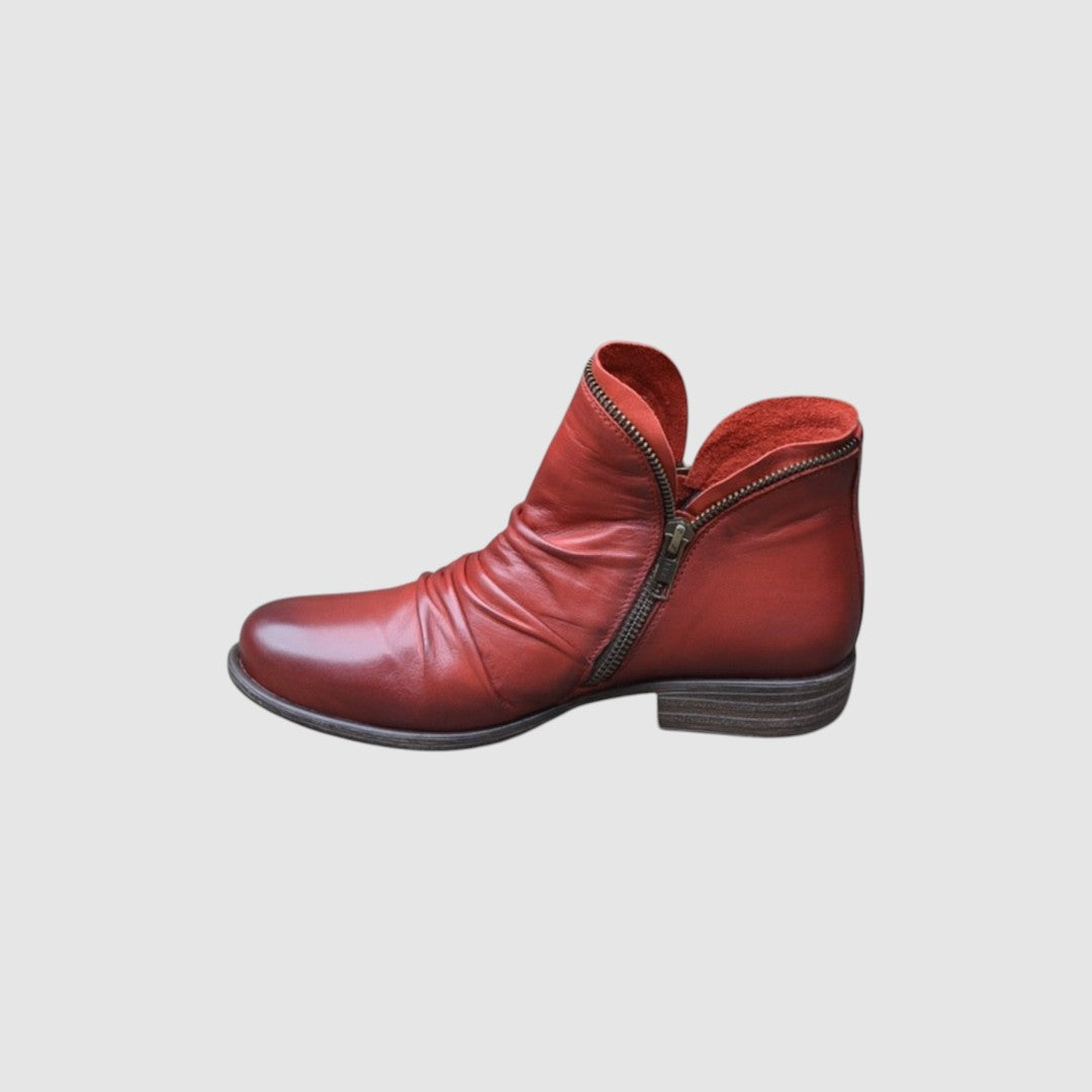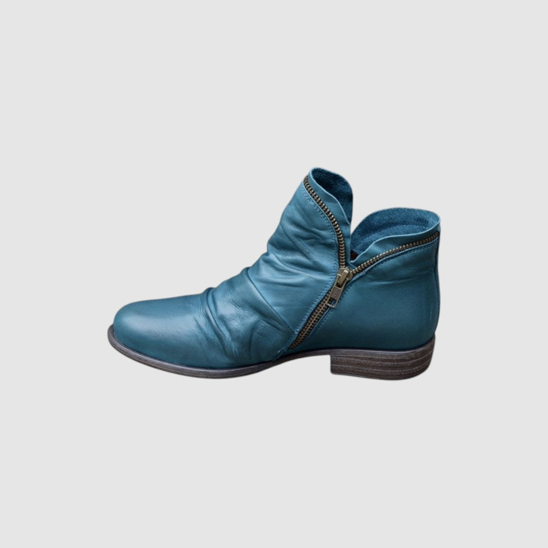Moderní a pohodlné kotníkové boty, které spojují ležérní styl s praktickým provedením. Díky postrannímu zipu se snadno obouvají a vyzouvají, zatímco kvalitní materiál zajišťuje dlouhou životnost. Jemné řasení na svršku dodává botám originální vzhled, který se hodí k džínům i šatům.