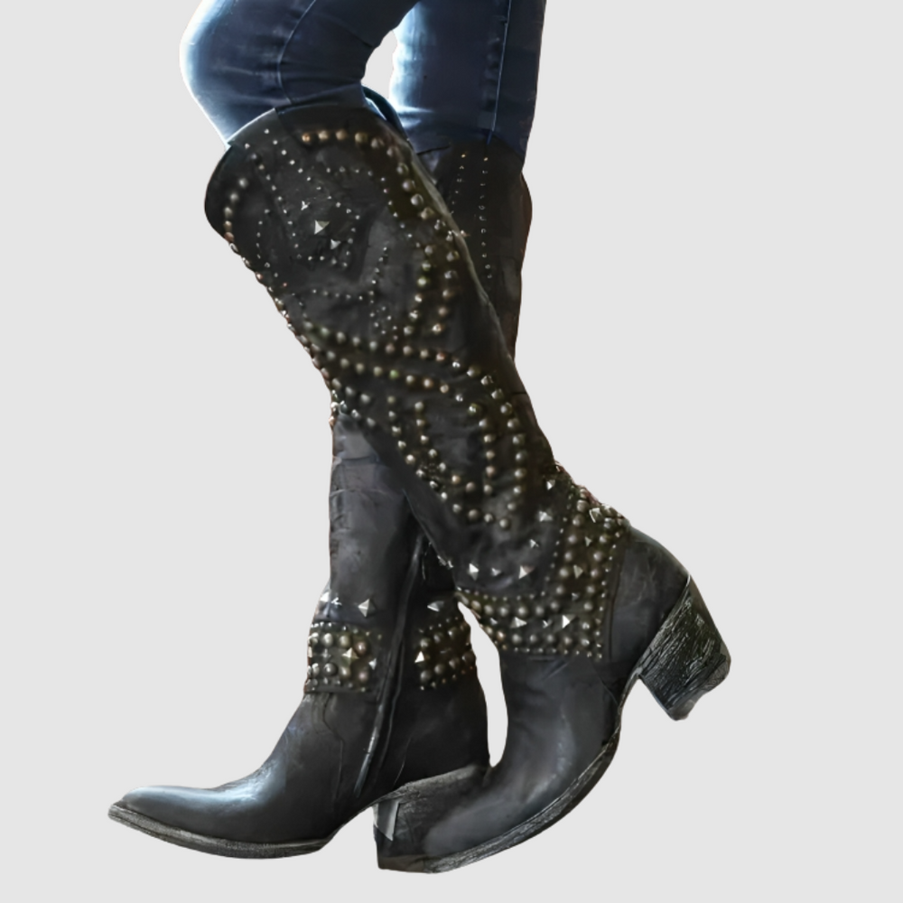 Tyto stylové kozačky přinášejí jedinečnou kombinaci westernového šarmu a moderní elegance. Bohaté zdobení s kovovými prvky dodává botám výrazný vzhled, díky kterému se stanou dominantním prvkem každého outfitu.
