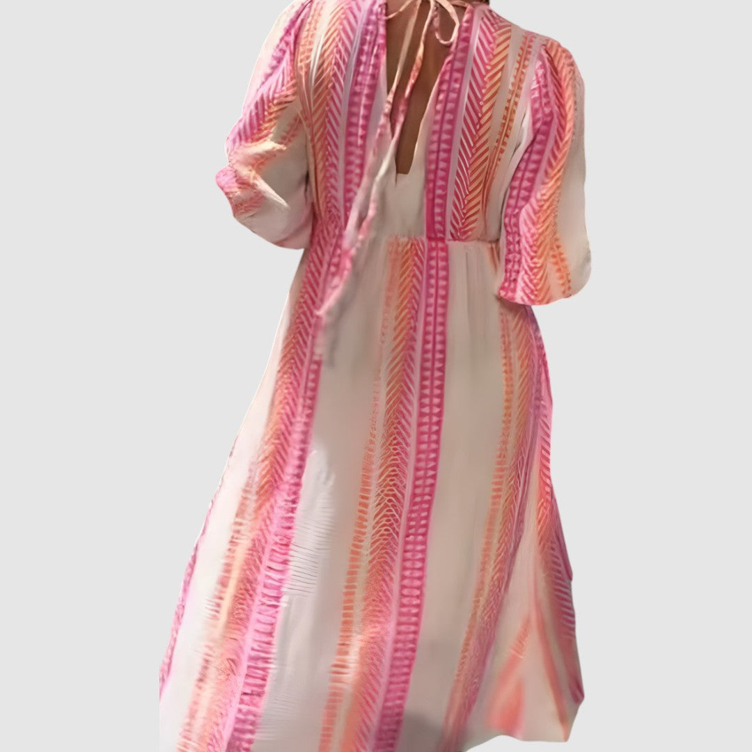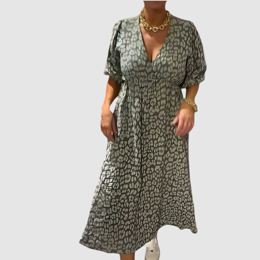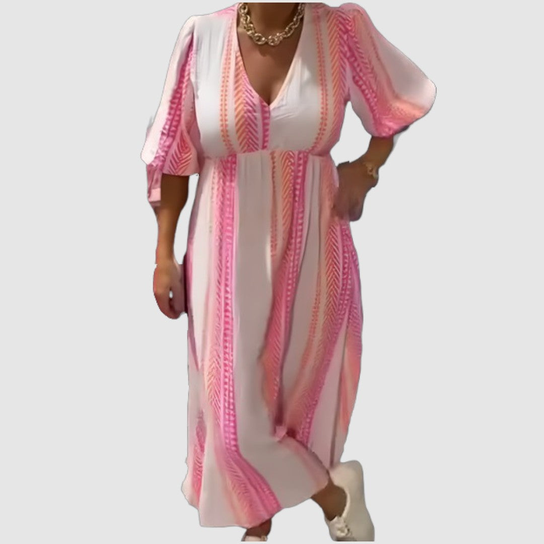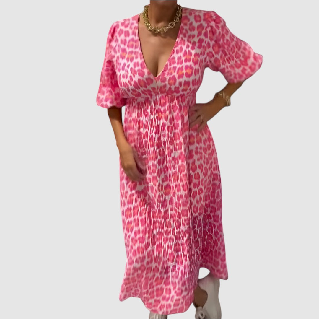 Pohodlné a stylové šaty, které spojují ležérní střih s elegantním designem. Díky volnému padnoucímu střihu a vzdušnému materiálu jsou ideální pro každodenní nošení i letní procházky. Výstřih do V a široké rukávy dodávají modelu ženský a trendy vzhled.