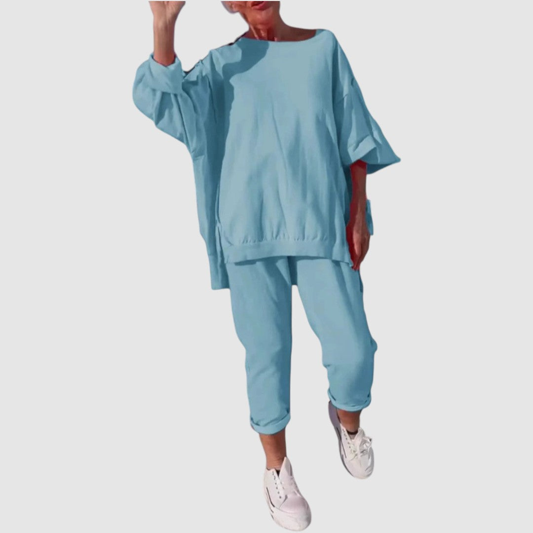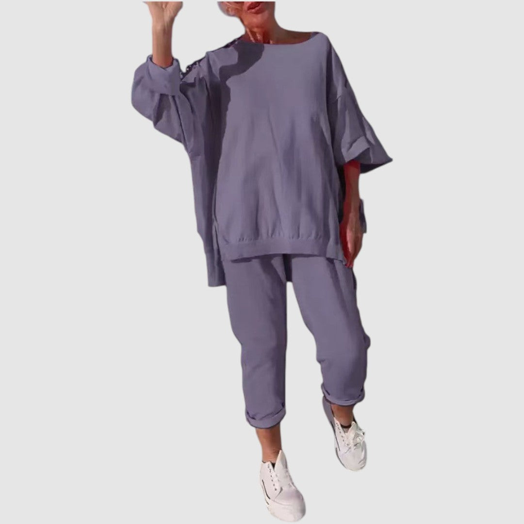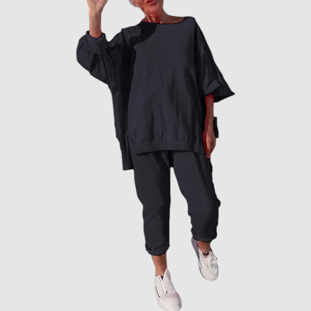 Lehký a stylový set navržený pro každodenní relax i volný čas. Kombinuje pohodlný top a kalhoty s volným střihem, které poskytují volnost pohybu a příjemný pocit během nošení. Ideální pro domácí pohodu, cestování nebo ležérní vycházky.
