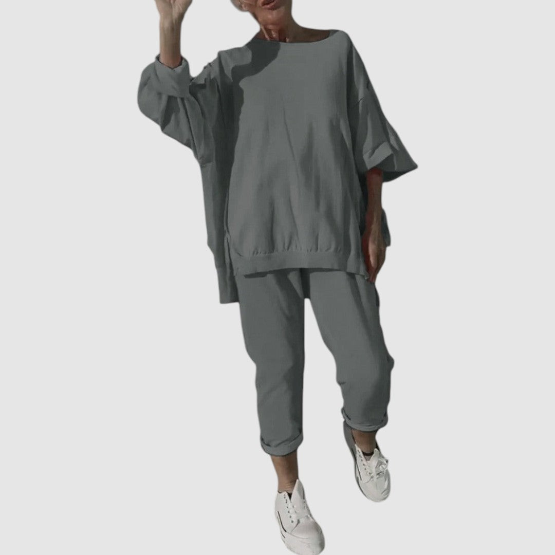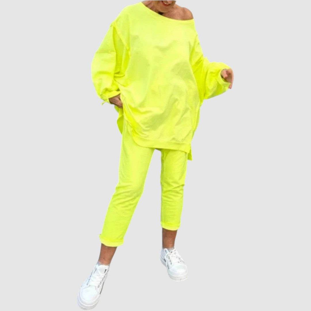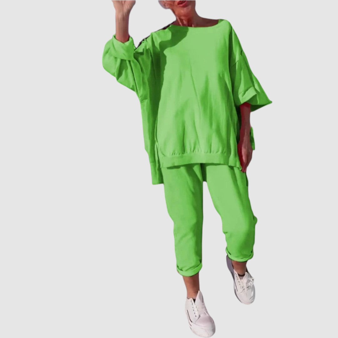 Lehký a stylový set navržený pro každodenní relax i volný čas. Kombinuje pohodlný top a kalhoty s volným střihem, které poskytují volnost pohybu a příjemný pocit během nošení. Ideální pro domácí pohodu, cestování nebo ležérní vycházky.