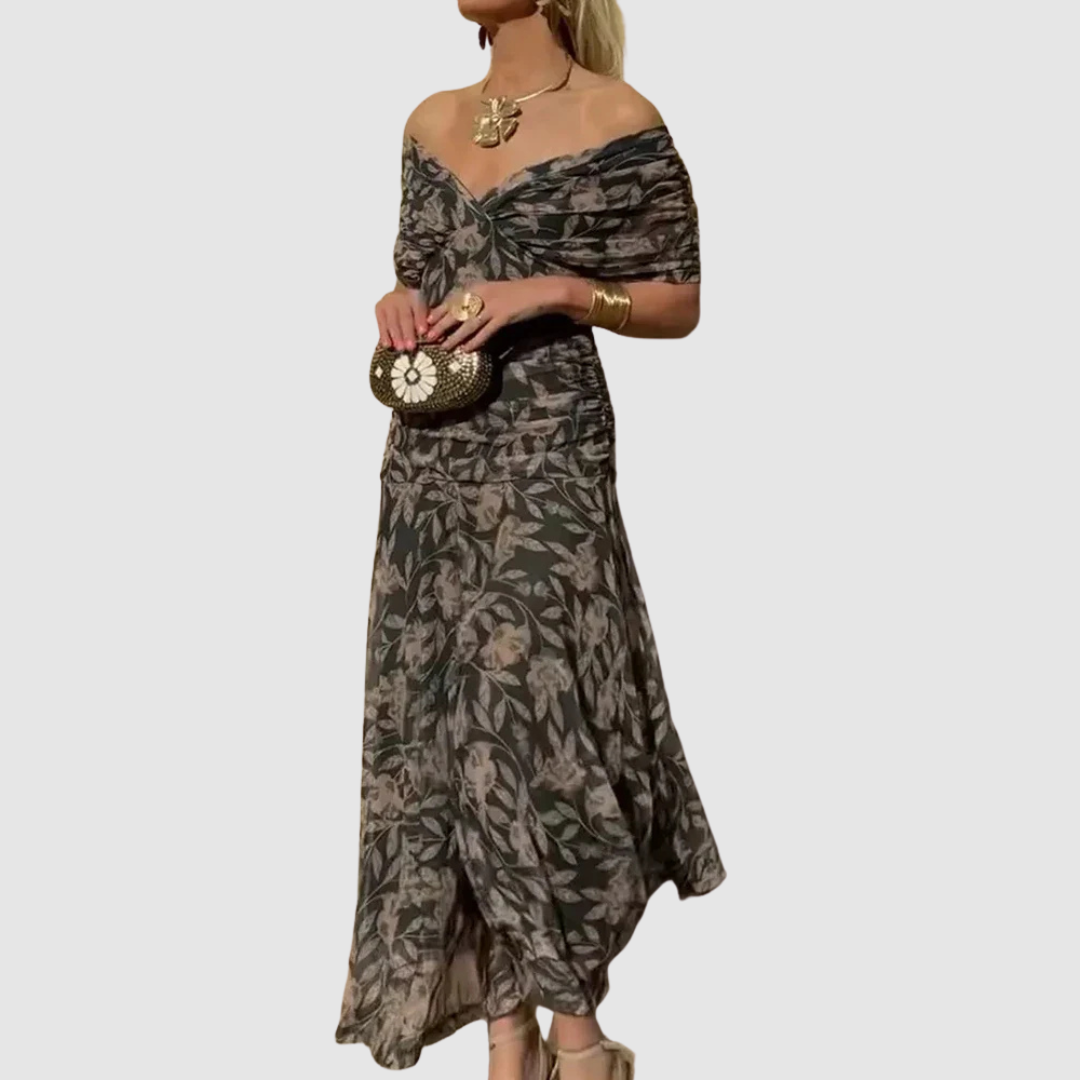 Tyto šaty působí smyslně a elegantně díky svému střihu s odhalenými rameny a jemně řaseným detailem. Jsou perfektní volbou pro slavnostní příležitosti, kdy chcete zazářit a cítit se výjimečně. Lehce splývavá sukně dodává celkovému vzhledu půvab a ženskost.