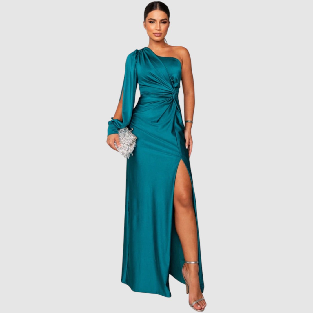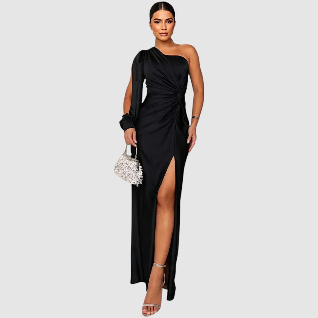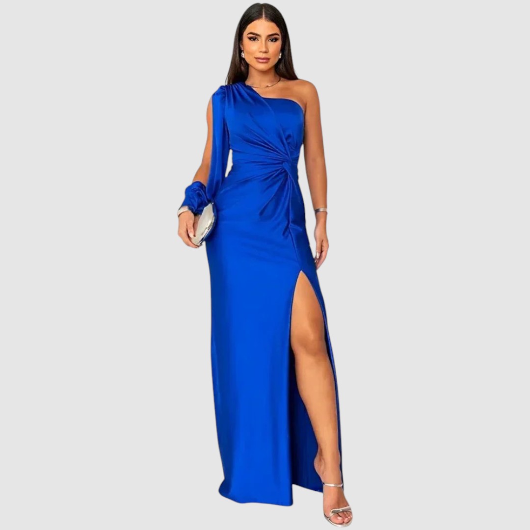 Elegantní šaty, které zaujmou svým jedinečným asymetrickým střihem a sofistikovaným detailem v pase. Vysoký rozparek dodává modelu odvážný a ženský charakter, zatímco přiléhavý střih krásně zvýrazní postavu. Perfektní volba pro večerní akce, plesy nebo slavnostní příležitosti.