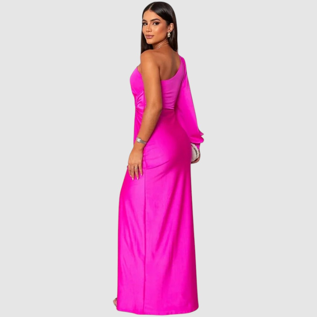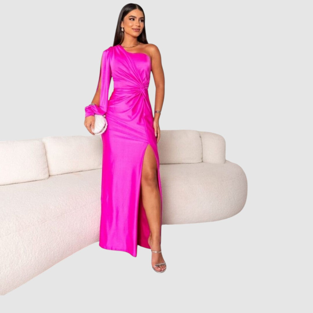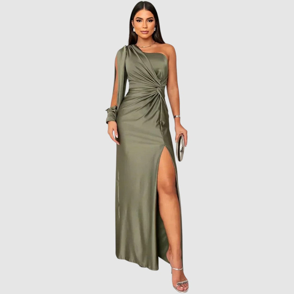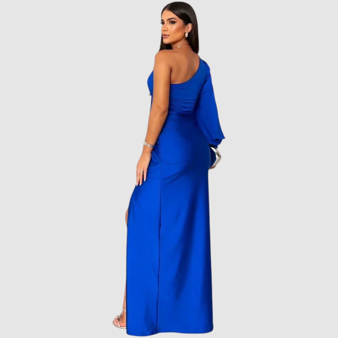 Elegantní šaty, které zaujmou svým jedinečným asymetrickým střihem a sofistikovaným detailem v pase. Vysoký rozparek dodává modelu odvážný a ženský charakter, zatímco přiléhavý střih krásně zvýrazní postavu. Perfektní volba pro večerní akce, plesy nebo slavnostní příležitosti.