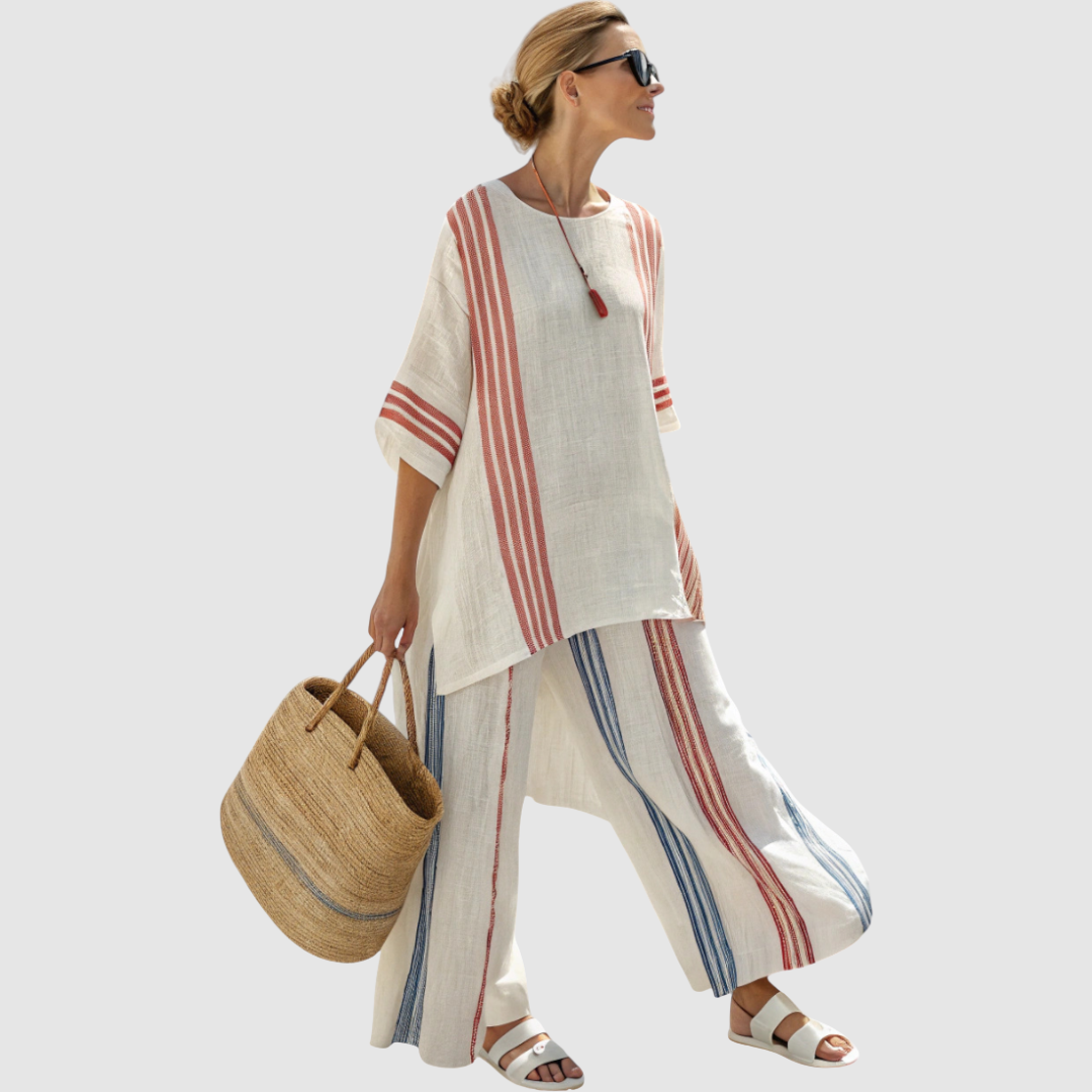 Tato souprava je ideální volbou pro ženy, které chtějí spojit pohodlí a lehkost s moderním stylem. Díky vzdušnému materiálu a volnému střihu poskytuje maximální komfort během teplých dní, zatímco originální pruhované detaily dodávají jedinečný vzhled.