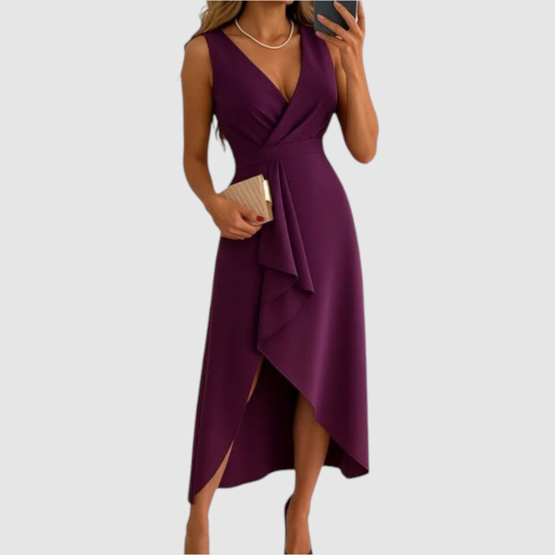 Okouzlující šaty s moderním asymetrickým střihem, které podtrhují ženskou siluetu a dodávají outfitu nádech sofistikovanosti. Hlubší výstřih a decentní volán v přední části působí žensky a elegantně. Perfektní volba pro svatby, večírky nebo jiné slavnostní události.